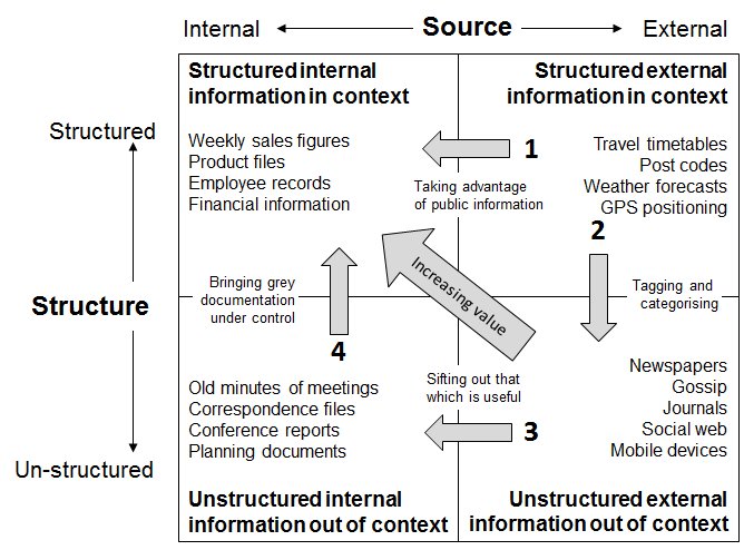 The information portfolio lays out these two discriminators as a 2x2 matrix, and provides examples in each quadrant: